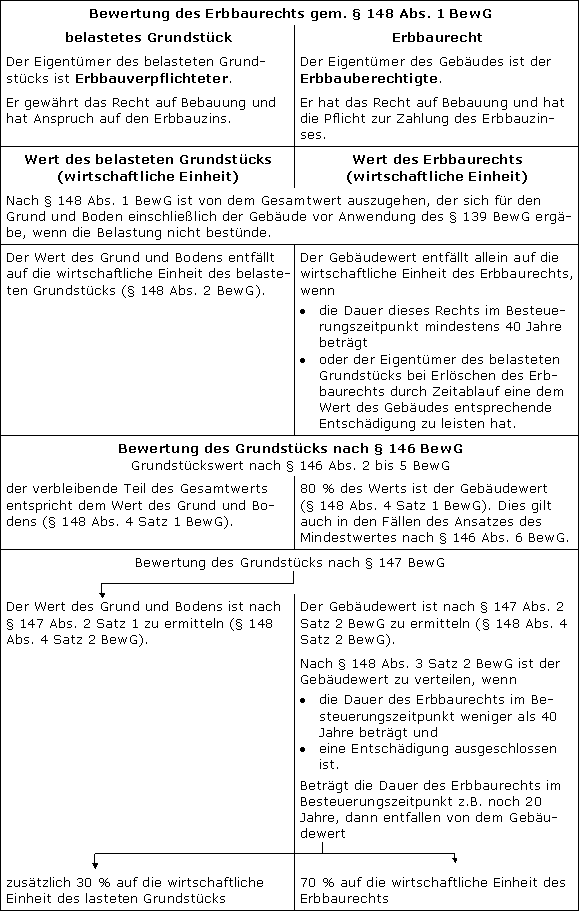 Die bisherige Regelung des § 148 BewG für die Bewertung von Erbbaurechten unter Zugrundelegung des gezahlten Erbbauzinses und eines einheitlichen Vervielfachers von 18,6 für die gesamte Laufzeit des Erbbaurechts führt insbesondere bei kurzen Restlaufzeiten zu nicht vertretbaren Bewertungsergebnissen. Sie wurde daher durch eine Regelung ersetzt, wonach dem Eigentümer des Grund und Bodens (Erbbauverpflichteter) grundsätzlich dessen Wert und dem Erbbauberechtigten grundsätzlich der Wert des Gebäudes zugerechnet wird. In Fällen, in denen die Laufzeit des Erbbaurechts weniger als 40 Jahre beträgt und das Gebäude nach Ablauf des Erbbaurechts entschädigungslos auf den Erbbauverpflichteten übergeht, ist der Gebäudewert dem Erbbauberechtigten nur noch anteilig zuzurechnen.