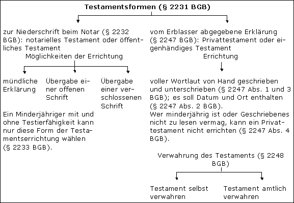 Das Testament ist eine einseitige, jederzeit widerrufliche Verfügung von Todes wegen (§ 1937 BGB). Zum Widerruf siehe §§ 2253–2258 BGB. Das Testament kann nur persönlich errichtet werden (§ 2064 BGB). Voraussetzung für die Errichtung oder Aufhebung eines Testaments ist die Testierfähigkeit (§ 2229 BGB); danach muss der Minderjährige das 16. Lebensjahr vollendet haben.