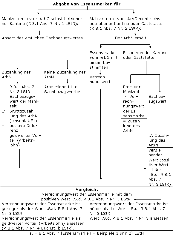 Lohnsteuerrechtlich ist nach R 8.1 Abs. 7 Nr. 2 und 3 LStR als geldwerter Vorteil grundsätzlich der Sachbezugswert abzgl. der Zuzahlung (Wert der Essensmarke) anzusetzen. Nach R 8.1. Abs. 7 Nr. 4 Buchst. b LStR ist der Verrechnungswert der Essensmarke anzusetzen, wenn dieser Wert den geldwerten Vorteil nach R 8.1 Abs. 7 Nr. 3 LStR unterschreitet.