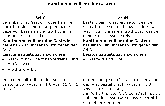 Bestellt der ArbN in einer Gaststätte selbst sein gewünschtes Essen und bezahlt es auch an den Gastwirt, liegt eine sonstige Leistung des Gastwirts an den ArbN vor. Ein Umsatzgeschäft zwischen ArbG und Gastwirt besteht nicht. Ein Leistungsverhältnis zwischen ArbG und ArbN liegt nicht vor. Die Zahlung des Essenszuschusses des ArbG an den Gastwirt ist im Verhältnis zum ArbN ein nicht umsatzsteuerbarer Vorgang (Abschn. 1.8 Abs. 12 Nr. 2 UStAE).