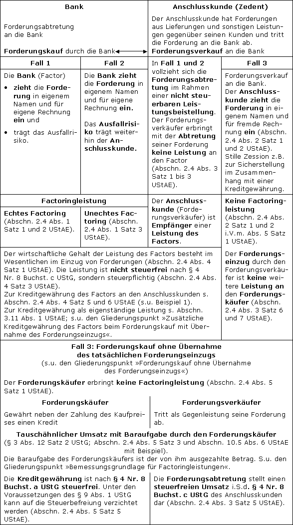 Nach den Regelungen in Abschn. 2.4 Abs. 1 bis 8 UStAE ist das Factoring wie folgt zu behandeln: