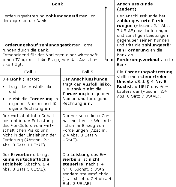 Die Nachfolgeentscheidung des BFH vom 4.9.2003 (V R 34/99, BStBl II 2004, 667) zum EuGH-Urteil vom 26.6.2003 lässt sich wie folgt zusammenfassen: Beim sog. echten Factoring, bei dem der Factor Forderungen eines Unternehmers (des sog. Anschlusskunden) ankauft, ohne gegen diesen bei Ausfall von Schuldnern ein Rückgriffsrecht zu haben, liegen umsatzsteuerrechtlich keine Umsätze des Forderungsverkäufers (Anschlusskunden) an den Factor, sondern Umsätze des Factors an den Anschlusskunden vor (Änderung der Rechtsprechung; Abschn. 2.4 Abs. 3 Satz 1 bis 3 UStAE). Kauft ein Factor Forderungen unter Übernahme des Ausfallrisikos auf und berechnet er seinem Kunden dafür Gebühren, liegt eine »Einziehung von Forderungen« i.S.d. § 4 Nr. 8 Buchst. c UStG vor, die von der Steuerbefreiung nach § 4 Nr. 8 Buchst. c UStG ausgenommen ist. Die Einziehung der Forderungen ist steuerpflichtig und führt nicht zum Ausschluss des Vorsteuerabzugs (Abschn. 2.4 Abs. 4 Sätze 1 bis 3 UStAE).
