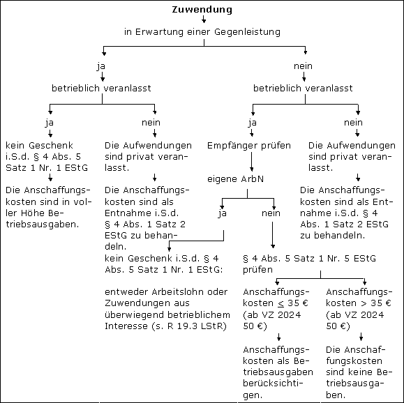 Zuwendungen können in unterschiedlichster Form aus unterschiedlichen Gründen an unterschiedliche Empfänger geleistet werden. Geschenke an natürliche und juristische Personen, die nicht ArbN des Stpfl. sind (z.B. an Kunden, Geschäftsfreunde und fremde Arbeitnehmer), gehören zu den nicht abzugsfähigen Betriebsausgaben des § 4 Abs. 5 Satz 1 Nr. 1 EStG, wenn sie im Veranlagungszeitraum je Empfänger insgesamt 35 € (ab VZ 2024 50 €) übersteigen (R 4.10 Abs. 2 bis 4 EStR, H 4.10 Abs. 2 bis 4 EStH). Es handelt sich dabei um eine Freigrenze.