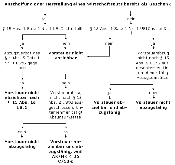 Steht im Zeitpunkt des Erwerbs oder der Herstellung eines Gegenstands seine Verwendung als Geschenk noch nicht fest, kann der Vorsteuerabzug zunächst unter den allgemeinen Voraussetzungen des § 15 UStG beansprucht werden. Im Zeitpunkt der Hingabe des Geschenks ist eine Vorsteuerkorrektur nach § 17 Abs. 2 Nr. 5 UStG vorzunehmen, wenn die Freigrenze von 35 € überschritten wird.