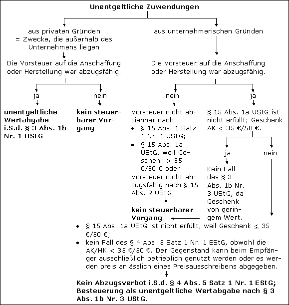 Zu b) Die Abgabe der Konzertkarte erfolgt aus unternehmerischen Gründen und ist daher ein der Art nach nicht steuerbarer Vorgang, da § 3 Abs. 9a UStG Wertabgaben aus unternehmerischen Gründen nicht erfasst. Ein Geschenk i.S.d. § 4 Abs. 5 Satz 1 Nr. 1 EStG und damit ein Fall des § 15 Abs. 1a UStG liegt nicht vor, da die Abgabe im Rahmen einer Verlosung erfolgt (vgl. R 4.10 Abs. 4 Satz 5 Nr. 3 EStR). Da es an einem steuerbaren Ausgangsumsatz fehlt, dem der Leistungsbezug direkt und unmittelbar zugeordnet werden kann, ist für den Vorsteuerabzug die Gesamttätigkeit des A maßgeblich.