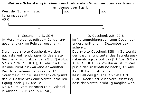 Im Zeitpunkt der Anschaffung der Geschenke im Voranmeldungszeitraum Januar tätigt U Aufwendungen, die unter das Abzugsverbot des § 4 Abs. 5 Satz 1 Nr. 1 EStG fallen. Die Vorsteuer ist im Zeitpunkt der Anschaffung nach § 15 Abs. 1a UStG nicht abziehbar. Auch für die noch nicht verschenkten Gegenstände ist die Vorsteuer im Januar nicht abziehbar, da hierfür die vorsteuerschädliche Verwendung vorgesehen ist.