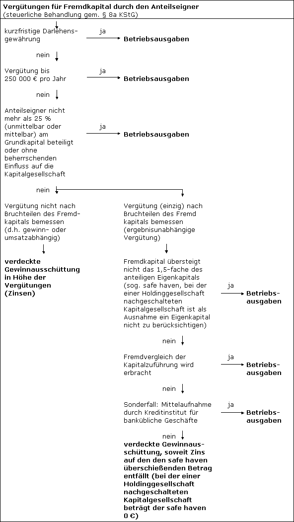 Die Vergütungen (z.B. Zinsen) der KapGes, der das Fremdkapital gewährt wurde, werden als verdeckte Gewinnausschüttung behandelt. Es ist weder eine Freigrenze noch ein sog. safe haven zu berücksichtigen. Es spielt keine Rolle, ob das Fremdkapital nach einem Bruchteil bemessen ist oder nicht. Es besteht nämlich nicht die Möglichkeit, eine verdeckte Gewinnausschüttung zu verneinen, weil etwa ein Fremdvergleich zur Mittelaufnahme angestellt wird.