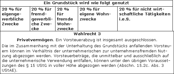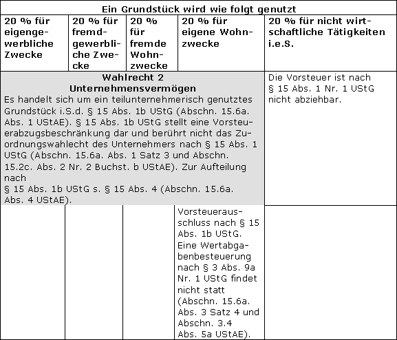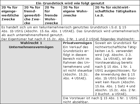 Das Zuordnungswahlrecht einheitlicher, gemischt genutzter Gegenstände (Grundstücke) regelt die Verwaltung in Abschn. 15.2c. UStAE (s.a. → Unternehmensvermögen).