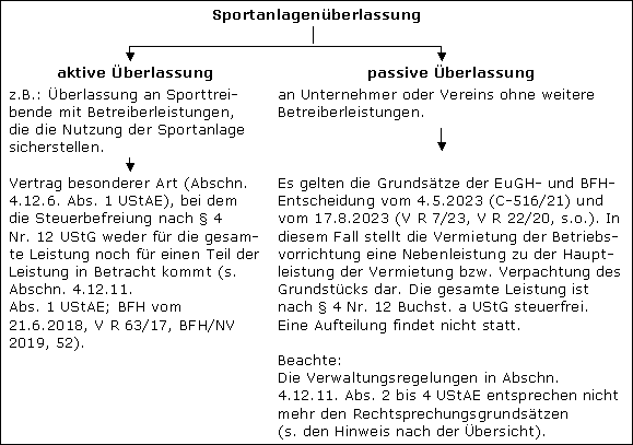 Mit Urteil vom 21.6.2018 (V R 63/17, BFH/NV 2019 52) bestätigt der BFH die bisherige EuGH- und BFH-Rspr., indem er feststellt, dass die entgeltliche Überlassung einer Sporthalle regelmäßig nicht nur die passive Zurverfügungstellung des Grundstücks umfasst. Deshalb ist die entgeltliche Überlassung einer Sporthalle regelmäßig keine bloße Raumüberlassung und deshalb nicht gem. § 4 Nr. 12 Buchst. a UStG steuerfrei (s.a. die Gliederungspunkte 4.2.2.3 »Die Vermietung von Sportanlagen unter Beachtung der EuGH- und BFH-Rechtsprechung« sowie 4.2.2.4 »Auswirkungen der Rechtsprechung auf die Verwaltungsregelungen« in Abschn. 4.12.11. UStAE).