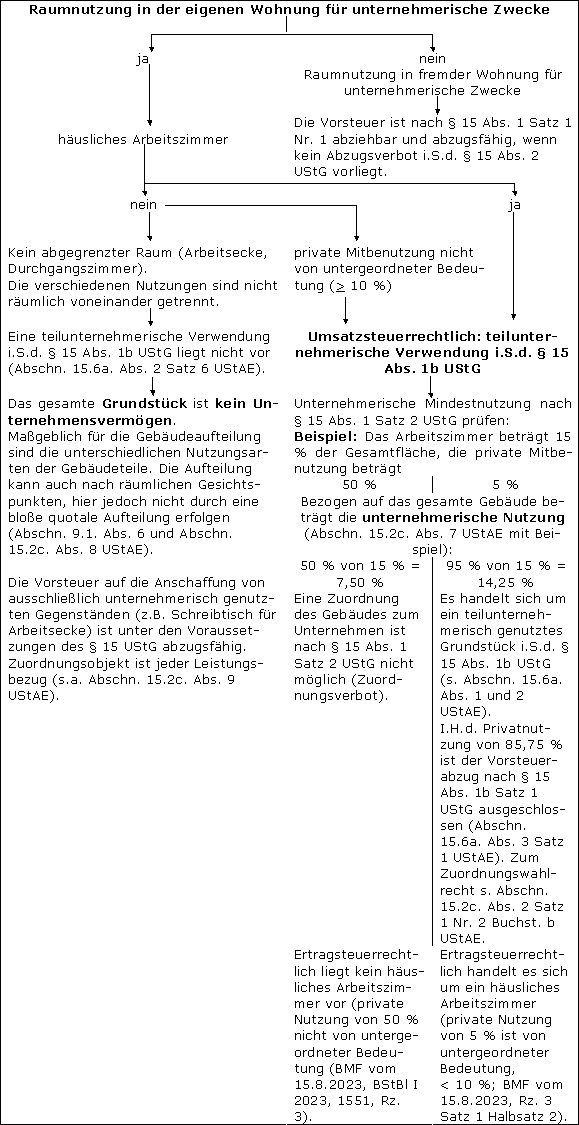 Wird das häusliche Arbeitszimmer i.S.d. § 4 Abs. 5 Satz 1 Nr. 6b EStG unternehmerisch genutzt, sind die damit im Zusammenhang stehenden Vorsteuerbeträge gem. § 15 Abs. 1 UStG abziehbar. Eine Beschränkung des Vorsteuerabzugs auf die Höhe der abzugsfähigen BA ist in § 15 Abs. 1a UStG nicht vorgesehen.