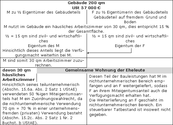 Ehemann M, der nach den vorstehenden Grundsätzen für Zwecke des Vorsteuerabzugs als Leistungsempfänger anzusehen ist, steht nach § 15 Abs. 1 UStG der Vorsteuerabzug zu, wenn und soweit die Leistung für sein Unternehmen ausgeführt wurde. Da bei der Ehegattengemeinschaft nur der Gemeinschafter M unternehmerisch tätig ist und dieser einen Teil des Gebäudes ausschließlich für seine unternehmerischen Zwecke verwendet, steht ihm das Vorsteuerabzugsrecht aus den bezogenen Leistungen anteilig zu, soweit der seinem Unternehmen zugeordnete Anteil am Gegenstand seinen Miteigentumsanteil nicht übersteigt (Abschn. 15.2b. Abs. 1 Satz 10 und 11 UStAE).