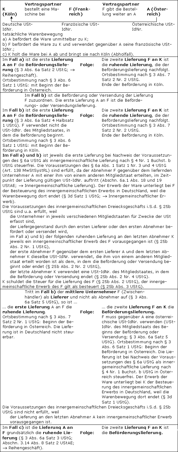Wird die Beförderung oder Versendung der zweiten Lieferung im Dreiecksgeschäft zugeordnet, weil der mittlere Unternehmer in seiner Eigenschaft als Lieferer auftritt, liegt kein innergemeinschaftliches Dreiecksgeschäft vor. Die Beförderung oder Versendung wird nicht der Lieferung an F, sondern der Lieferung durch F an K zugeordnet wird (Abschn. 25b.1 Abs. 5 Satz 2 und 3 UStAE).