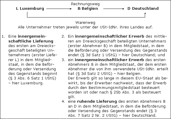 Die Vereinfachungsregelung des innergemeinschaftlichen Dreiecksgeschäfts besteht darin, dass eine steuerliche Registrierung des mittleren Unternehmers B im Bestimmungsland Deutschland vermieden wird. Die steuerbare und steuerpflichtige Lieferung des B aus Belgien wird durch D in Deutschland durchgeführt.