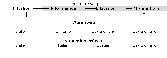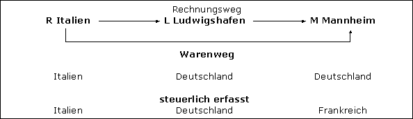 S.a. Beispiel 1. R aus Rom verkauft Pkws an L aus Ludwigshafen, der seinerseits die Pkws an M aus Mannheim verkauft. R transportiert die Pkws mit eigenem Lkw am 28.2.07 unmittelbar zu M. R und L treten jeweils unter der USt-IdNr. ihres Landes auf. M tritt nicht unter seiner deutschen USt-IdNr., sondern unter seiner französischen USt-IdNr. auf.