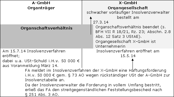 Das FG Sachsen (Urteil vom 13.4.2021, 3 K 1304/19, EFG 2021, 1953) gab dem Insolvenzverwalter recht. Eine Haftung nach § 73 AO für die USt für den Voranmeldungszeitraum März 14 bestehe nicht, weil diese bei Beendigung der Organschaft am 27.3.14 rechtlich noch nicht entstanden gewesen sei. Die Steuer für die Leistungen im Voranmeldungszeitraum März 14 sei erst mit Ablauf des 31.3.14 entstanden. Auf eine wirtschaftliche oder insolvenzrechtliche Verursachung der Steuer komme es nicht an.