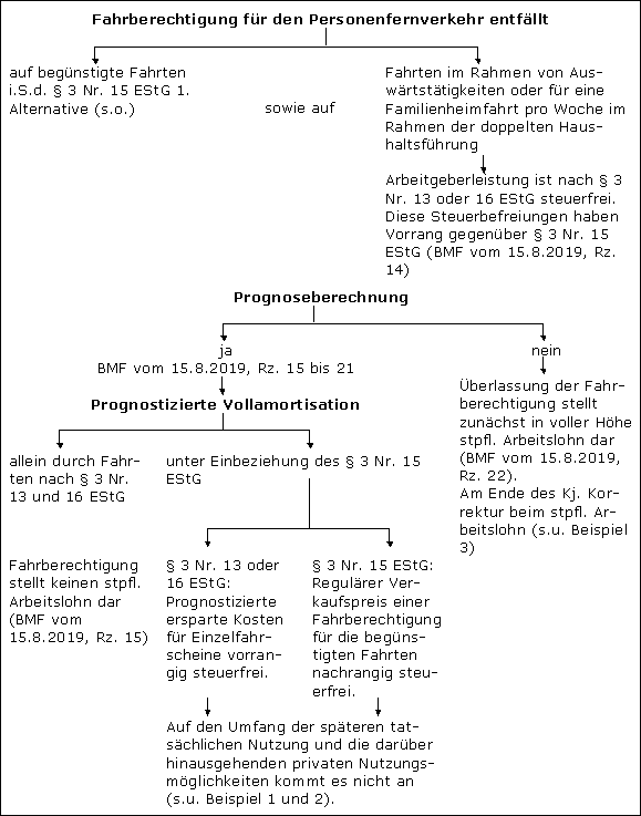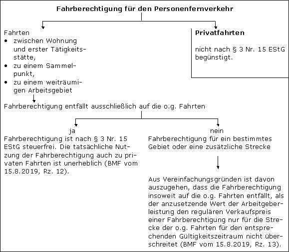 Arbeitgeberleistungen, die zur Nutzung des Personenfernverkehrs berechtigen, sind nach § 3 Nr. 15 EStG steuerfrei, soweit sie auf Fahrten zwischen Wohnung und erster Tätigkeitsstätte sowie zu einem Sammelpunkt oder einem weiträumigen Tätigkeitsgebiet (§ 9 Abs. 1 Satz 3 Nr. 4a Satz 3 EStG) entfallen; Privatfahrten im Personenfernverkehr sind hingegen nicht begünstigt (BMF vom 15.8.2019, BStBl I 2019, 875, Rz. 11).