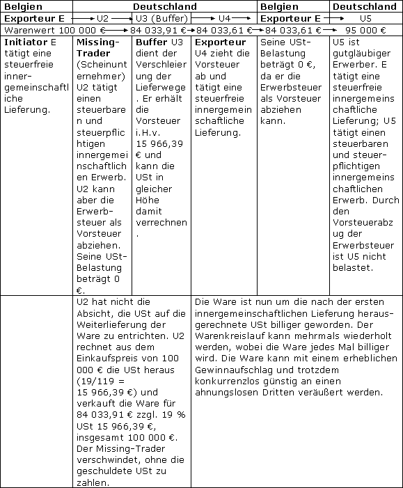 Der erste Empfänger der Ware, der die USt auf seine Warenlieferung nicht entrichtet, verschwindet, sobald das FA versucht, die fällige USt bei ihm beizutreiben. Er wird daher als Missing-Trader bezeichnet.