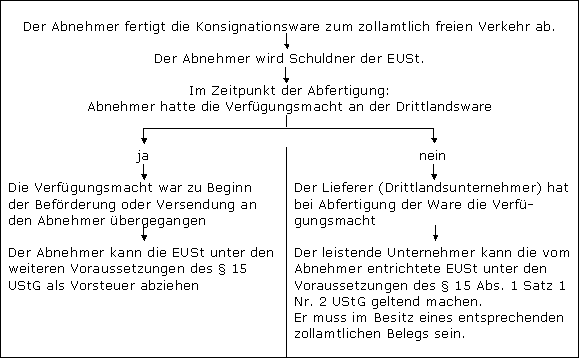 Ob der Abnehmer befugt ist, die EUSt als Vorsteuer geltend zu machen, hängt davon ab, ob er im Zeitpunkt der Abfertigung die Verfügungsmacht an der Drittlandsware hatte (Abschn. 15.8 Abs. 4 Satz 2 UStAE; → Einfuhrumsatzsteuer unter dem Gliederungspunkt »Vorsteuerabzug der Einfuhrumsatzsteuer«). Der Übergang erfolgt – wie bereits oben ausgeführt – abhängig davon, ob der Abnehmer bei Beginn der Beförderung oder Versendung bereits verbindlich feststand. Ist die Verfügungsmacht bereits bei Beginn der Beförderung oder Versendung auf den Abnehmer übergegangen, kann der Abnehmer die EUSt (unter den weiteren Tatbestandsmerkmalen des § 15 Abs. 1 Satz 1 Nr. 2 UStG) als Vorsteuer abziehen.