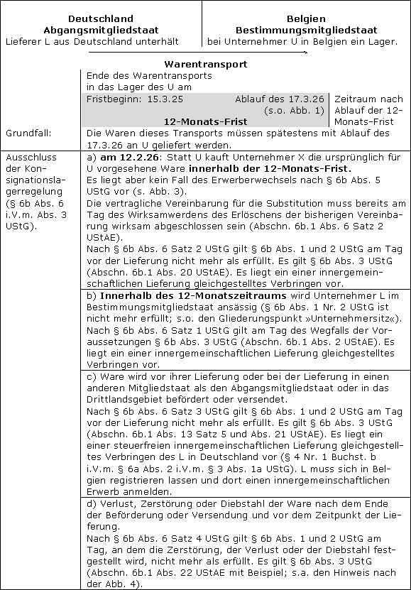 Zur Berechnung der 12-Monats-Frist des § 6b Abs. 3 UStG s. Abschn. 6b.1 Abs. 15 UStAE mit Beispiel. Der Zeitraum von 12 Monaten beginnt am Tag nach Beendigung des Warentransportes im Bestimmungsmitgliedstaat (Einlagerung im Lager; Art. 3 Abs. 1 VO 1182/71). Für die Berechnung der Frist gelten die Grundsätze der Art. 2 und 3 der Verordnung (EWG, Euratom) Nr. 1182/71 vom 3.6.1971; § 108 Abs. 1 AO findet insoweit keine Anwendung. Der Unternehmer hat die Einhaltung der Frist durch Angabe des Tags der Einlagerung und des Tags der Entnahme (Lieferung i.S.d. § 6b Abs. 2 UStG) nachzuweisen. Der Inhalt und der Umfang der Aufzeichnungspflichten ergibt sich aus § 22 Abs. 4f UStG.