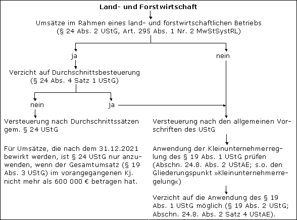 Wiegand, Abgrenzung der Land- und Forstwirtschaft vom Gewerbe, NWB 2012, 460; Stelter, Erteilung von Reitunterricht im Zusammenhang mit landwirtschaftlichen Betrieben, NWB 33/2018, 2422; Becker, Steuerfreie Vermietung an Pauschallandwirte, NWB 5/2021, 336; Potjans u.a., Vorsteuerabzug bei Vorräten und Waren aufgrund der Änderung des § 24 UStG zum 1.1.2022, NWB 41/2021, 3032; Kruhl, Durchschnittssatz für land- und forstwirtschaftliche Betriebe nach § 24 UStG ab 1.1.2022 neu geregelt, UStB 2022, 55; Potjans u.a., Umsatzbesteuerung von Land- und Forstwirten nach der Änderung zum 1.1.2022 – Darstellung und Einordnung des BMF-Schreibens vom 2.6.2022, NWB 48/2022, 3375.
