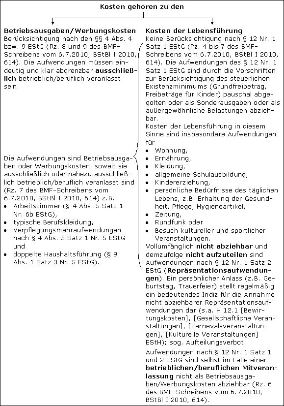 § 12 Nr. 1 Satz 2 EStG enthält ein Abzugsverbot für Lebensführungsaufwendungen, die auch zur Förderung des Betriebs oder Berufs geeignet erscheinen. Verboten wird primär der Abzug der eigentlichen Repräsentationsaufwendungen, d.h. solcher Ausgaben, zu denen der Stpfl. sich aufgrund seiner beruflichen Position verpflichtet sieht und denen er sich nicht entziehen kann. Betroffen sind die Aufwendungen, die im Zusammenhang mit der wirtschaftlichen oder gesellschaftlichen Stellung stehen und – nebenbei – zugleich auch den Beruf fördern. Bei diesen Aufwendungen greifen die beruflichen und privaten Veranlassungsbeiträge so ineinander, dass eine Trennung nicht möglich ist. Damit fallen nicht nur Ausgaben zur Befriedigung des Renommierbedürfnisses und Aufwendungen mit Repräsentationscharakter unter das Abzugsverbot, sondern auch Lebensführungskosten mit beiläufigem beruflichen Bezug, die auch nach der Rechtsprechungsänderung zum Aufteilungs- und Abzugsverbot für gemischte Aufwendungen nicht aufteilbar sind oder wegen ihrer Zugehörigkeit zu den unverzichtbaren Aufwendungen für die Lebensführung nicht abziehbar sind. Nach dem BMF-Schreiben vom 6.7.2010 (BStBl I 2010, 614) ist bei der Frage, ob es sich um Repräsentationsaufwendungen handelt oder (zumindest teilweise) ein Betriebsausgaben-/Werbungskostenabzug sattfindet, stets durch eine Gesamtwürdigung aller Umstände des Einzelfalles festzustellen. Bei Veranstaltungen, die vom Stpfl. ausgerichtet werden, stellt ein persönlicher Anlass (z.B. Geburtstag, Trauerfeier) regelmäßig ein bedeutendes Indiz für die Annahme nicht abziehbarer Repräsentationsaufwendungen dar. Auch Aufwendungen für gesellschaftliche Veranstaltungen fallen i.d.R. unter § 12 Nr. 1 Satz 2 EStG.