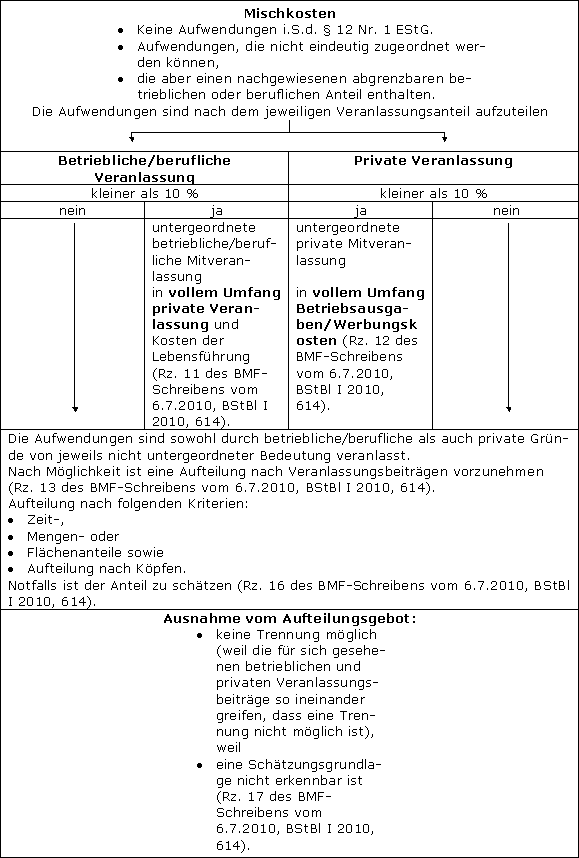 Die Verwaltung hatte bisher in § 12 Nr. 1 Satz 2 EStG ein allgemeines Aufteilungs- und Abzugsverbot gesehen (s. bisher R 12.1 EStR und H 12.1 [Aufteilungs- und Abzugsverbot] EStH; diese Regelungen sind seit Bekanntgabe des BMF-Schreibens vom 6.7.2010 (BStBl I 2010, 614) zur steuerlichen Beurteilung gemischter Aufwendungen überholt; R 12.1 und R 12.2 EStR sind daher seit EStR 2012 vom 25.3.2013 (BStBl I 2013, 276) unbesetzt), das der BFH seit jeher einschränkend dahin auslegt, dass es nicht anzuwenden ist, wenn und soweit sich der dem Beruf dienende Teil der Aufwendungen nach objektiven Maßstäben mit Sicherheit und leicht – ggf. im Wege der Schätzung – abgrenzen lässt. An dieser Rspr. hat der Große Senat des BFH ausdrücklich festgehalten (vgl. BFH Urteil vom 19.10.1970, GrS 2/70, BStBl II 1971, 17 unter II. 6. der Gründe). Der Große Senat hat in diesem Zusammenhang zutreffend darauf hingewiesen, dass das Aufteilungsverbot seinem Sinn und Zweck nach (Gerechtigkeit und Gleichmäßigkeit der Besteuerung) in denjenigen Fällen nicht anzuwenden ist, in denen eine gerechte und der Sachlage entsprechende Aufteilung nach objektiven und leicht nachprüfbaren Maßstäben möglich erscheint.