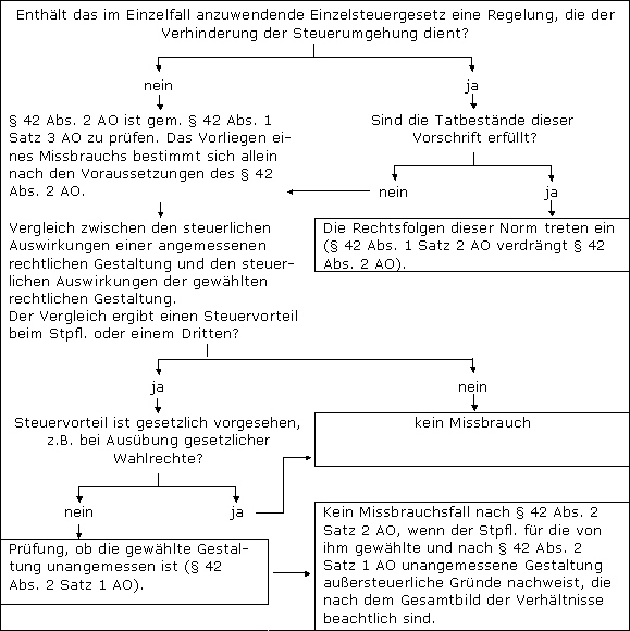 Bevor die Missbrauchsregelung des § 42 Abs. 2 AO geprüft wird, ist das jeweilige Einzelsteuergesetz dahingehend zu überprüfen, ob dieses eine Regelung enthält, die der Verhinderung der Steuerumgehung dient. Aus § 42 Abs. 1 und 2 AO ergibt sich folgende Prüfungsreihenfolge zur Feststellung des Missbrauchs: