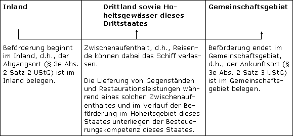 Bei einer Schiffsreise von Hamburg (Abgangsort) nach New York (Ankunftsort) bestimmt sich der Ort der Lieferung und der sonstigen Leistung nicht nach § 3e UStG, da keine Beförderung innerhalb des Gemeinschaftsgebiets stattfindet. Gilt der Abgangsort des Beförderungsmittels nicht als Ort der Lieferung oder Restaurationsleistung, bestimmt sich der Ort nach § 3 Abs. 6 bis 8 UStG bzw. nach § 3a Abs. 3 Nr. 3 Buchst. b UStG (Abschn. 3e.1. Satz 4 i.V.m. Abschn. 3a.6 Abs. 9 UStAE).