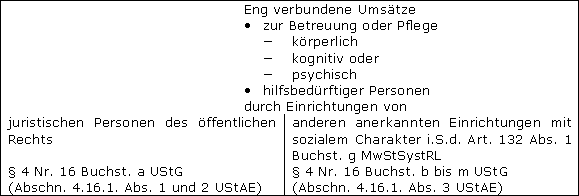 1. § 4 Nr. 16 Satz 1 Buchst. a UStG: eng mit der Betreuung oder Pflege körperlich, kognitiv oder psychisch hilfsbedürftiger Personen verbundene Leistungen von Einrichtungen des öffentlichen Rechts (Abschn. 4.16.1. Abs. 2 UStAE) und