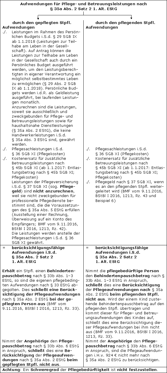 Schmidt, Änderungen im (Familien-)Pflegezeitgesetz, NWB 7/2015, 427; Marburger, Aktuelles zur Pflegeversicherung – Änderungen durch das Pflegestärkungsgesetz II, NWB 3/2016, 188; Marburger, Neuregelungen der Versicherungs- und Beitragspflicht für Pflegende ab dem 1.1.2017, NWB 13/2016, 948; Kanzler, Krankheits- und pflegebedingte Ausgaben und Einnahmen (Teil 1) – Berücksichtigung von eigenen Betreuungs- und Pflegeaufwendungen, NWB 26/2020, 1921; Kanzler, Krankheits- und pflegebedingte Ausgaben und Einnahmen (Teil 2) – Übernahme der Aufwendungen für Angehörige und Dritte, NWB 27/2020, 2000; Kanzler, Krankheits- und pflegebedingte Ausgaben und Einnahmen (Teil 3) – Steuerbefreiung von Einkünften aus Pflegeleistungen, NWB 28/2020, 2087; Strecker, Steuerermäßigung nach § 35a EStG bei ambulanten Pflege- und Betreuungsleistungen, NWB 29/2022, 2024.