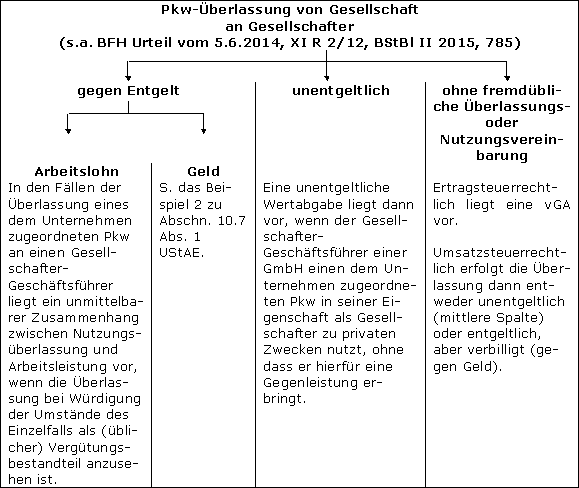 Geserich, Privatnutzung des Firmen-Pkw durch angestellten Gesellschafter-Geschäftsführer – Verdeckte Gewinnausschüttung/Arbeitslohn? –, NWB 2010, 178; Wäger, Steuerbare Leistungen im Rahmen von Gesellschaftsverhältnissen, UR 2008, 69, 75; Doege, Kfz-Gestellung in Fällen der umsatzsteuerlichen Organschaft, DStR 2014, 938; Greif, Überlassung eines dem Unternehmen zugeordneten Pkw an einen Gesellschafter-Geschäftsführer – Anmerkung zum BFH-Urteil vom 5.6.2014, XI R 2/12, NWB 47/2014, 3543; Schmitz-Herscheid, Dienstwagenüberlassung an Gesellschafter-Geschäftsführer – quo vadis?, NWB 19/2016, 1429. Schmitz-Herscheid, 1 %-Regelung beim Gesellschafter-Geschäftsführer – Wann gilt ein Anscheinsbeweis? –, NWB 27/2021, 1940.