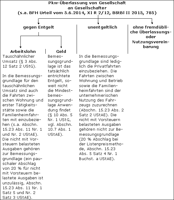 S. dazu die Ausführungen unter → Pkw-Nutzung sowie Abschn. 15.23 Abs. 5 UStAE. Zur Überlassung eines dem Unternehmen zugeordneten Pkw an einen Gesellschafter-Geschäftsführer zur privaten Nutzung und zur Ermittlung der umsatzsteuerrechtlichen Bemessungsgrundlage s.a. die BFH-Urteile vom 5.6.2014 (XI R 2/12, BStBl II 2015, 785 und XI R 3/12, BFH/NV 2015, 64, LEXinform 0929188 sowie die Anmerkungen vom 21.10.2014, LEXinform 0652493 und vom 14.10.2014, LEXinform 0652491; s.a. die Pressemitteilung des BFH Nr. 66/2014 vom 8.10.2014, LEXinform 0442403; s.a. Greif, NWB 47/2014, 3543).