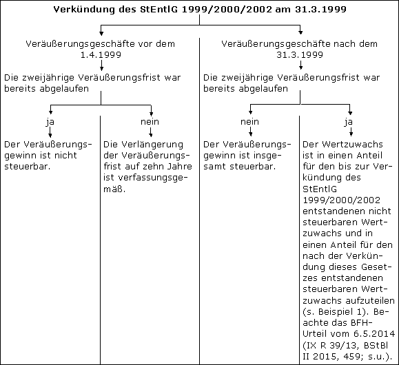 Im Zuge des StEntlG 1999/2000/2002 (BGBl I 1999, 402) wurde die Vorschrift des § 23 EStG grundlegend umgestaltet. So wurde der Umfang der steuerbaren Geschäfte u.a. dadurch deutlich erweitert, in dem die Veräußerungsfristen für Gewinne aus der Veräußerung privater Grundstücke von zwei auf zehn Jahre und für Wertpapiere von sechs Monaten auf ein Jahr verlängert wurden. Die Regelung ist auf alle Veräußerungsgeschäfte anwendbar, die auf einem nach dem 31.12.1998 rechtswirksam abgeschlossenen obligatorischen Vertrag oder gleichstehenden Rechtsakt beruhen.
