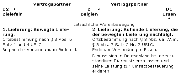 Bezüglich der Lieferungen D an N und N an B handelt es sich gem. § 25b UStG um ein innergemeinschaftliches Dreiecksgeschäft. Unter den Voraussetzungen des § 25b Abs. 2 UStG wird die Steuer für die Lieferung N an B in Belgien von B geschuldet.