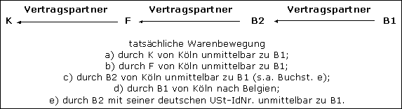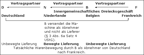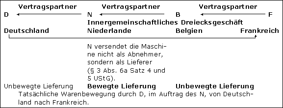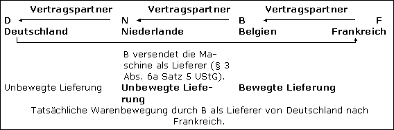 F in Frankreich bestellt eine Maschine bei B in Belgien, dieser wiederum bestellt die Maschine bei N in den Niederlanden und dieser bei D in Deutschland. N bittet den D, die Maschine unmittelbar an F zu befördern. Alle Beteiligten treten mit der USt-IdNr. ihres Landes auf.