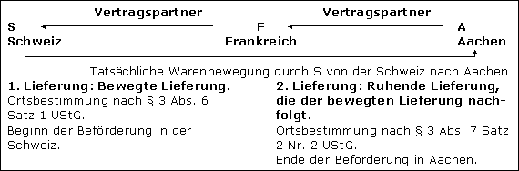 Die zweite Lieferung im Dreiecksgeschäft (B an F) ist eine ruhende Lieferung. Lieferort ist nach § 3 Abs. 7 Satz 2 Nr. 2 UStG Frankreich, da sie der Beförderungslieferung nachfolgt.