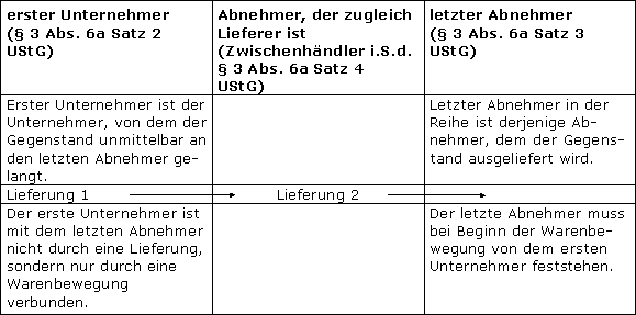 Ein innergemeinschaftliches Dreiecksgeschäft kann auch zwischen drei unmittelbar nacheinander liefernden Unternehmern bei Reihengeschäften mit mehr als drei Beteiligten vorliegen, wenn die drei unmittelbar nacheinander liefernden Unternehmer am Ende der Lieferkette stehen (Abschn. 25b.1. Abs. 2 Satz 2 UStAE). Der erste Abnehmer in dem Dreiecksgeschäft ist als mittlerer Unternehmer in der Reihe zugleich Abnehmer und Lieferer.