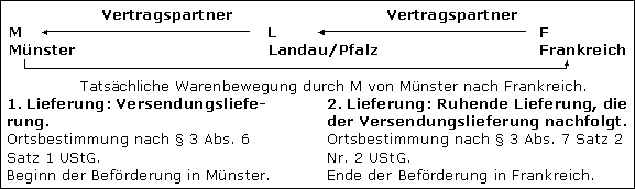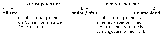 Der deutsche Unternehmer D bestellt für sein Einfamilienhaus in Landau/Pfalz einen Schrank beim Möbelhaus L in Landau/Pfalz. Der Schrank soll von L bei D nach den baulichen Gegebenheiten angepasst und aufgebaut werden. L bestellt die Schrankteile bei der Möbelfabrik M in Münster. M versendet die Schrankteile auf Weisung des L unmittelbar zu D. Die Monteure des L bauen den Schrank im Wohnzimmer des D auf und passen ihn dort an die baulichen Gegebenheiten an.