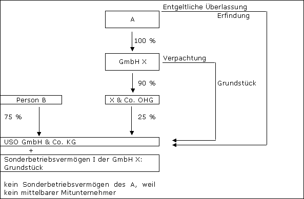 Die Annahme von Sonderbetriebsvermögen setzt die Mitunternehmerstellung des Eigentümers der WG voraus. Ohne unmittelbare Beteiligung an einer Mitunternehmerschaft kann grundsätzlich kein Sonderbetriebsvermögen gegeben sein. Nach § 15 Abs. 1 Satz 1 Nr. 2 Satz 2 EStG steht der mittelbar über eine oder mehrere PersGes beteiligte Gesellschafter einem unmittelbar beteiligten Gesellschafter gleich. Hieraus folgt, dass der mittelbar beteiligte Gesellschafter an einer Untergesellschaft bei dieser Sonderbetriebsvermögen haben kann (nach allgemeinen Grundsätzen; s. nachfolgendes Schaubild). Voraussetzung ist, dass die mittelbare Beteiligung an der untersten mitunternehmerischen PersGes ihrerseits (nur) durch die Anteile an anderen (Ober-)Personengesellschaften vermittelt wird (unmaßgeblich ist, wie hoch die Beteiligungen sind und wie viele Zwischen-Personengesellschaften in der Beteiligungskette vorhanden sind). Eine Unter-Personengesellschaft kann folglich Sonderbetriebsvermögen I und II ihrer unmittelbaren Mitunternehmer und zugleich auch Sonderbetriebsvermögen I und II von nur an der/den Ober-Personengesellschaften beteiligten Gesellschaftern haben.