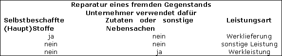 Reparaturen beweglicher körperlicher Gegenstände können in Form einer Werklieferung oder Werkleistung erbracht werden. Bei der Reparatur bearbeitet der Unternehmer einen fremden Gegenstand. Die Leistungsart der Reparaturleistung richtet sich danach, ob der Unternehmer für die Ausführung der Reparaturleistung zusätzliches Material verwendet, das er selbst beschafft hat.
