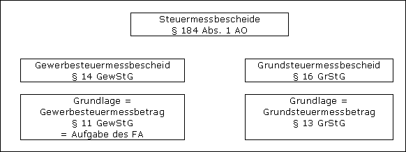 Durch einen Steuermessbescheid wird keine Steuer, sondern lediglich ein Steuermessbetrag festgesetzt. Dieser ist Berechnungsgrundlage für die entsprechende Steuer. Die Festsetzung von Steuermessbeträgen dient der Vereinfachung der Steuerfestsetzung im Rahmen der Gewerbe- und Grundsteuer. Steuermessbeträge (→ Steuermessbetrag), die nach den Steuergesetzen zu ermitteln sind, werden durch Steuermessbescheid festgesetzt (§ 184 Abs. 1 AO). Diese Steuermessbescheide bilden die Grundlage für die Festsetzung der sog. Realsteuern (Gewerbesteuer und Grundsteuer, § 3 Abs. 2 AO) durch die Gemeinden; sie sind sog. Grundlagenbescheide.