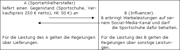 Beim tauschähnlichen Umsatz gilt das Recht über sonstige Leistungen (→ Sonstige Leistung); für eine Leistung kann aber auch das Recht über Lieferungen gelten. Zu beachten sind hier ebenfalls die Steuerbefreiungen.