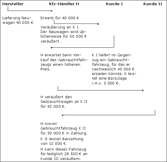 Für den Kunden K I würde sich der subjektive Wert seiner empfangenen Gegenleistung nach dem Verkaufswert des Gebrauchtfahrzeugs (45 000 €) zuzüglich der geleisteten Baraufgabe (hier 5 000 €) bestimmen. Diese nach der subjektiven Einschätzung des K I ermittelte Summe (hier 45 000 € + 5 000 €) bildet abzüglich der Baraufgabe (5 000 €) das Bruttoentgelt für die Lieferung des Gebrauchtfahrzeugs.