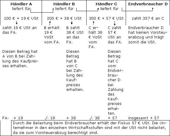 Umsatzsteuer wird auf jeder Wirtschaftsstufe einer Leistungskette (z.B. Produzent – Großhändler – Zwischenhändler – Einzelhändler) erhoben, die Höhe der USt wird durch Multiplikation des Nettoentgelts mit dem anzuwendenden Regelsteuersatz von 19 % bzw. dem ermäßigten Steuersatz von 7 % ermittelt. Jeder Erwerber oder Dienstleistungsempfänger wird dabei zunächst mit USt belastet, die Steuer wird dem Unternehmer jedoch vom Finanzamt in Form des Vorsteuerabzugs wieder erstattet, sofern kein Endverbrauch vorliegt. Aufgrund der dargestellten Wirkungsweise wird die Umsatzsteuer auch als Allphasen-Nettoumsatzsteuer mit Vorsteuerabzug bezeichnet.