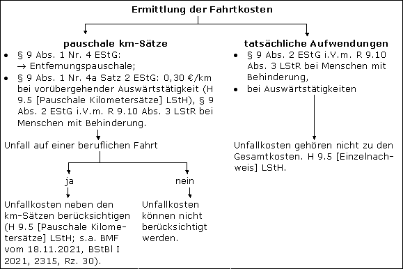 Zu den neben der Entfernungspauschale berücksichtigungsfähigen Unfallkosten gehören sowohl fahrzeug- und wegstreckenbezogene Aufwendungen (entgegen BFH vom 19.12.2019, VI R 8/18, BStBl II 2020, 291) als auch Aufwendungen im Zusammenhang mit der Beseitigung oder Linderung von Körperschäden, die durch einen Unfall auf einer beruflich veranlassten Fahrt zwischen Wohnung und erster Tätigkeitsstätte eingetreten sind (BMF vom 18.11.2021, BStBl I 2021, 2315, Rz. 30).