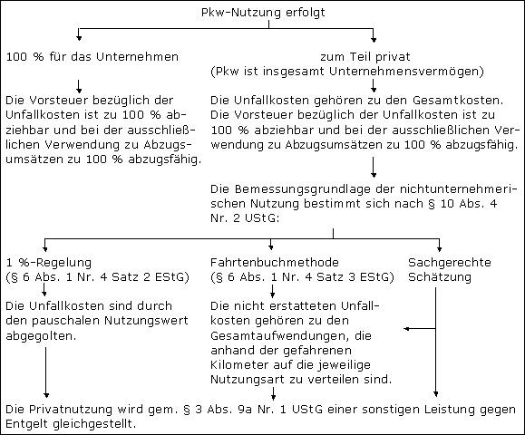 Umsatzsteuerrechtlich gehören die Unfallkosten zu den Gesamtkosten und bilden insgesamt mit den anderen Kosten die Bemessungsgrundlage für die unentgeltliche Wertabgabe nach § 10 Abs. 4 Nr. 2 UStG.