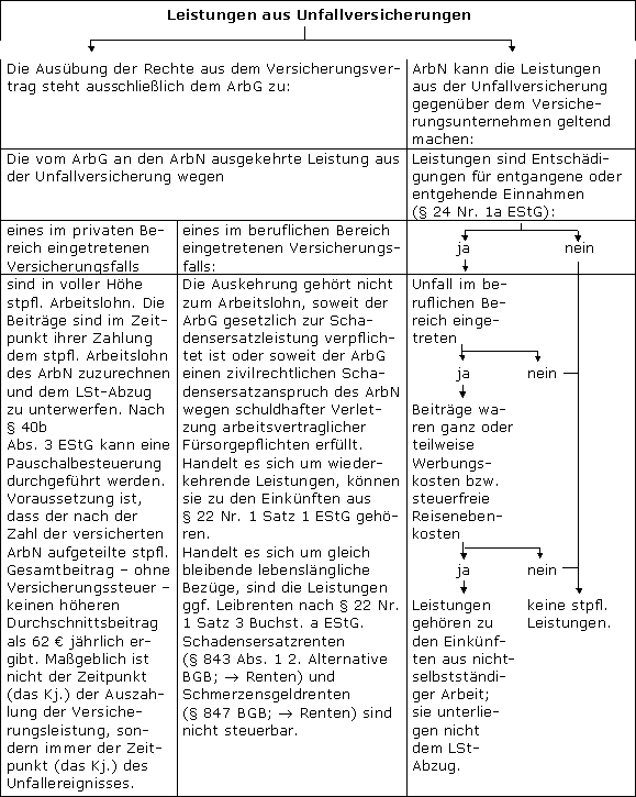 Die übernommenen Beiträge sind stpfl. Arbeitslohn. Die Beiträge sind im Zeitpunkt ihrer Zahlung dem stpfl. Arbeitslohn des ArbN zuzurechnen und dem LSt-Abzug zu unterwerfen. Das gilt nicht, soweit Beiträge zu Versicherungen gegen berufliche Unfälle und Beiträge zu Versicherungen gegen alle Unfälle auch das Unfallrisiko bei Auswärtstätigkeiten (R 9.4 Abs. 2 LStR 2011) abdecken. Nach § 40b Abs. 3 EStG kann eine Pauschalierung der Lohnsteuer durchgeführt werden. Voraussetzung ist, dass der nach der Zahl der versicherten ArbN aufgeteilte stpfl. Gesamtbeitrag – ohne Versicherungssteuer – keinen höheren Durchschnittsbeitrag als 62 € jährlich ergibt.
