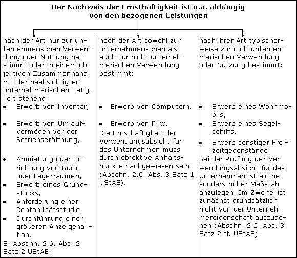 Maßgeblich für die Unternehmereigenschaft ist nicht die tatsächliche Einnahmeerzielung, sondern die Einnahmeerzielungsabsicht (Abschn. 2.6. Abs. 1 UStAE). Die Ernsthaftigkeit dieser Absicht muss durch objektive Merkmale nachgewiesen oder glaubhaft gemacht werden. Der Nachweis der Ernsthaftigkeit der Unternehmertätigkeit und somit der Einnahmeerzielungsabsicht ist abhängig von den bezogenen Leistungen.