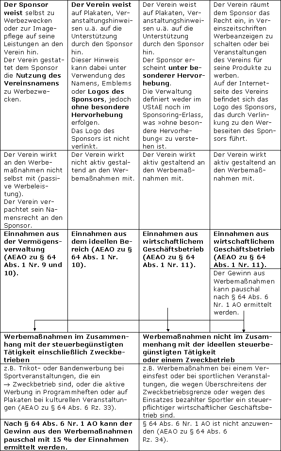 Zur umsatzsteuerrechtlichen Behandlung des Sponsorings aus der Sicht des Sponsors s. das BMF-Schreiben vom 25.7.2014 (BStBl I 2014, 1114) sowie Abschn. 1.1 Abs. 23 Satz 3 und 4 UStAE.