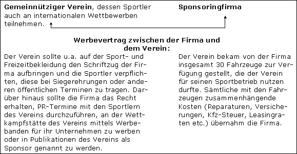 Im Urteilsfall war das Sponsoring immer aufgrund mündlicher Abreden durchgeführt worden. Auf die jeweilige Anfrage durch einen Vereinsvertreter, ob der Unternehmer bereit sei, für eine Mannschaft neue Sportbekleidung mit Werbeaufdruck »Fahrschule X« zur Verfügung zu stellen, habe der Sponsor bei positiver Entscheidung ein Sporthaus beauftragt die Sportbekleidung zu liefern, nachdem der Verein im Sporthaus die individuellen Kleidergrößen der Spieler mitgeteilt habe. Es liegt auf der Hand, dass die Spieler dann auch diese Sportbekleidung mit Werbeaufdruck getragen haben. Dass die Überlassung der Sportbekleidung nicht nur zur Förderung der sportlichen Zwecke, sondern auch mit dem Ziel der Werbung für die Fahrschule erfolgt sei, ist aus Sicht des Sponsors aufgrund des Werbeaufdrucks ersichtlich. Die Sportbekleidung werde deshalb nicht unentgeltlich überlassen.